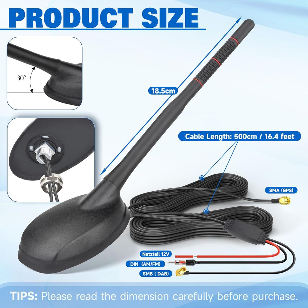 - Autoantennenanschluss: Diese SMB-Stecker, DIN-Stecker, SMA-Stecker vollelektronische Autoradio-Kombi-Dachantenne. Für den Signalempfang in digitalen DAB/DAB+ und analogen AM/FM-Radios und Autonavigationssystemen