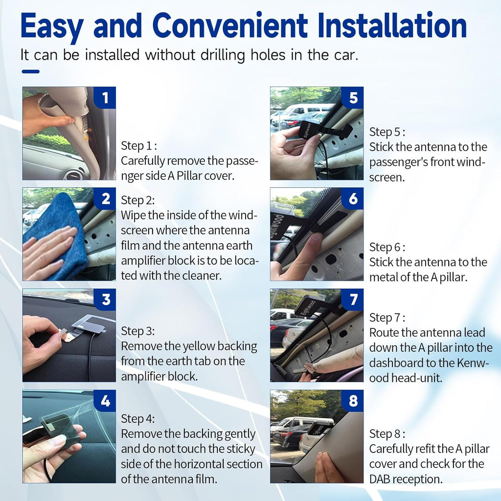 - DAB Scheibenantenne ist einfach und bequem zu installieren, kleben Sie es einfach an die Windschutzscheibe des Autos. Es kann installiert werden, ohne das Auto zu bohren. Es ist zu beachten, dass der Klebstoff DAB Scheibenantenne nicht für den Betrieb auf metallbeschichteten Windschutzscheiben oder Fahrzeugen mit beheizten Windschutzscheiben geeignet ist.