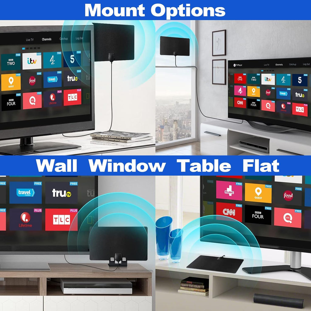- Easy Design & 10FT Coax Cable: the flat and thin antenna enables you hide it behind the TV set or stick it on the wall/ window or lay flat on the table. And the long cable allows you move it around to find the best position to place the antenna