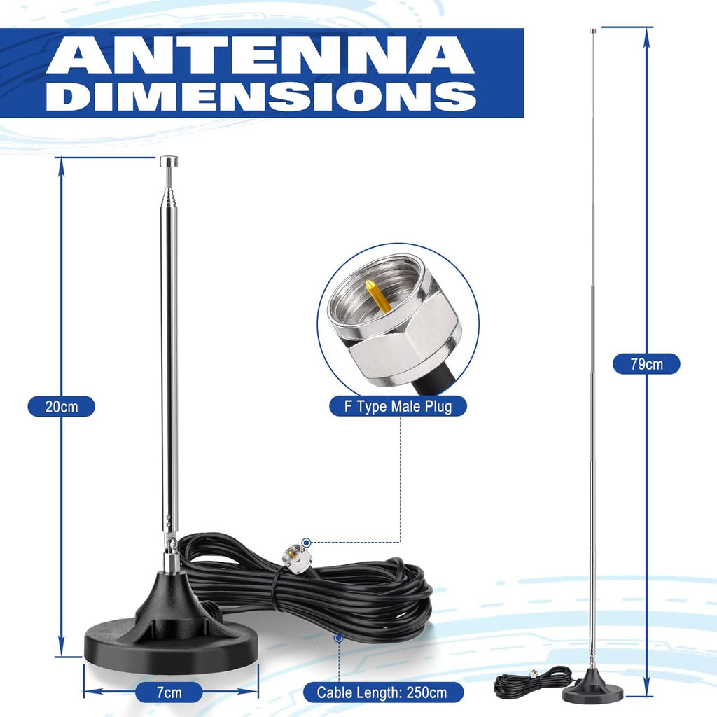 - Frequency Range: FM: 88-108MHz, DAB Band III: 174-240MHz, Band L: 1452-1492MHz | Impedance: 75 Ohm | Base: 7CM | Installation: Magnetic Base | Antenna Length: 20cm-79cm