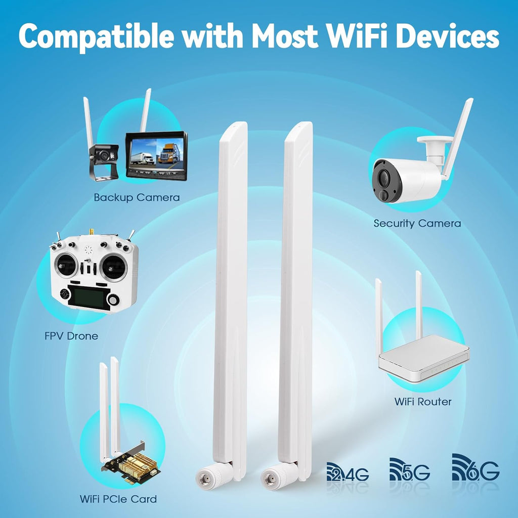 - Tri band WiFi: 2.4g(2400-2500MHz)/5g(5150-5850MHz)/6g(5900-7125MHz); Support 802.11 b/g/n/ac/ax/wifi 6/wifi 6e; Gain: 6dbi